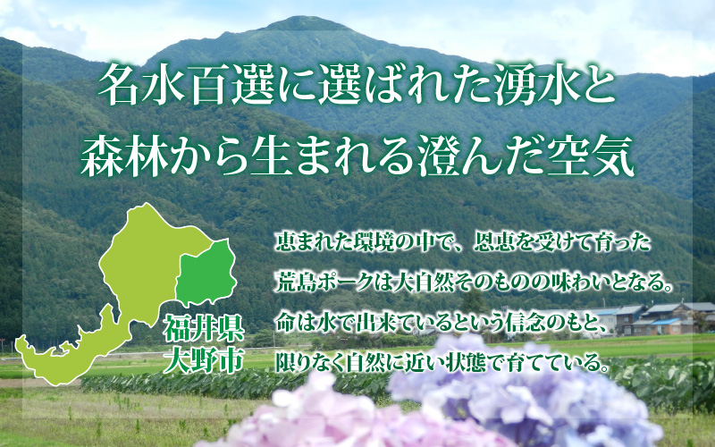 恵まれた環境の中で、その恩恵を受けて育った荒島ポークは大自然そのものの味わいとなり、命は水で出来ているという信念のもと、限りなく自然に近い状態で育てていいます。