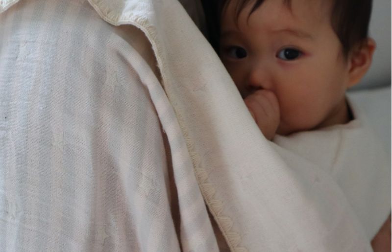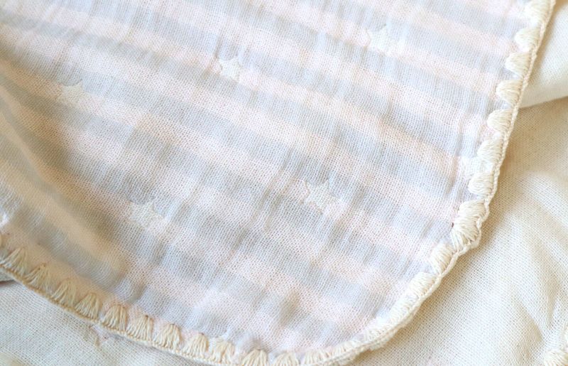 ペールカラーのボーダーに、織で表現する星柄はナチュラルで性別問わず人気のある返礼品。コットン100%の4重ガーゼ生地はふわふわの肌触りとサラッとした軽さが特徴。