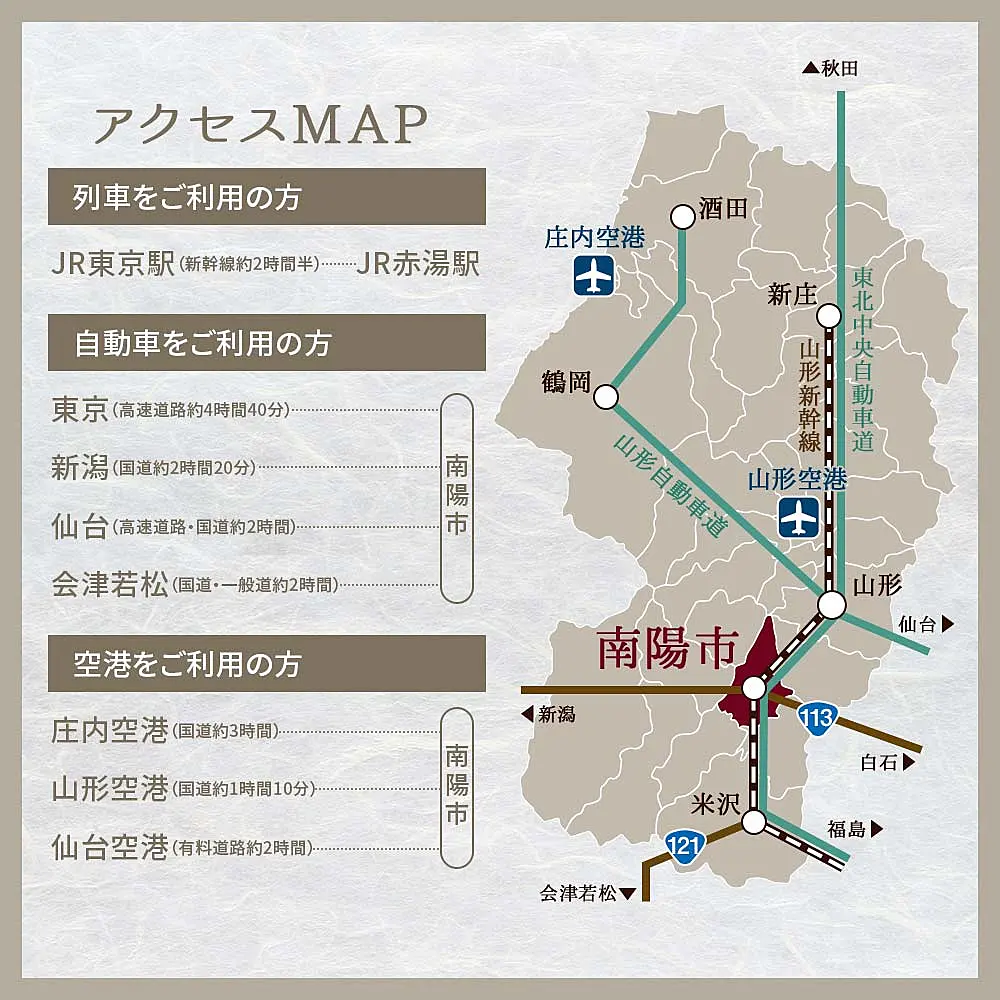 赤湯温泉のある南陽市は、東京駅から乗り換えなしで2時間半の好立地。JR「赤湯駅」から温泉宿までは車で数分です。風景を楽しみながら、お宿までテクテク歩くのもおススメ♪