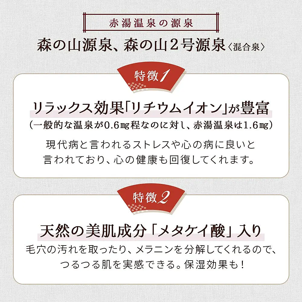 赤湯温泉の泉質は「含硫黄泉」。ナトリウム、カルシウム等が含まれ、古来から万病に効くと言われてきました。また、「メタケイ酸」の働きで“ツルツル肌”を実感しながら、体の芯までポカポカする「あったまりの湯・美人の湯」です。