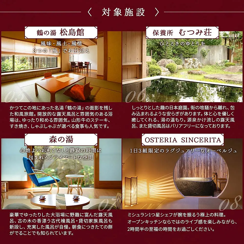検索キーワード : 山形 南陽 赤湯 温泉 旅館 ホテル 宿泊 割引券 助成券 チケット クーポン 美肌 美人の湯 あったまり 個室 家族風呂 ペット 街歩き 御殿守 櫻湯 山茱萸 丹泉 丹波館 松島館 むつみ荘 森の湯 瀧波 升形屋 大文字屋 大和屋 OSTERIA SINCERITA オステリア・シンチェリータ