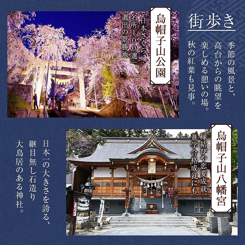 温泉街の裏手に広がる烏帽子山。春は山一面に桜が咲き誇る「日本さくら名所百選」にも選ばれた景勝地です。