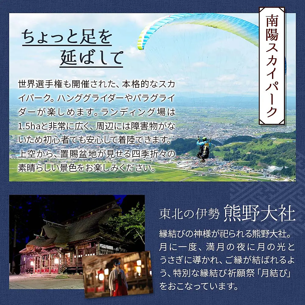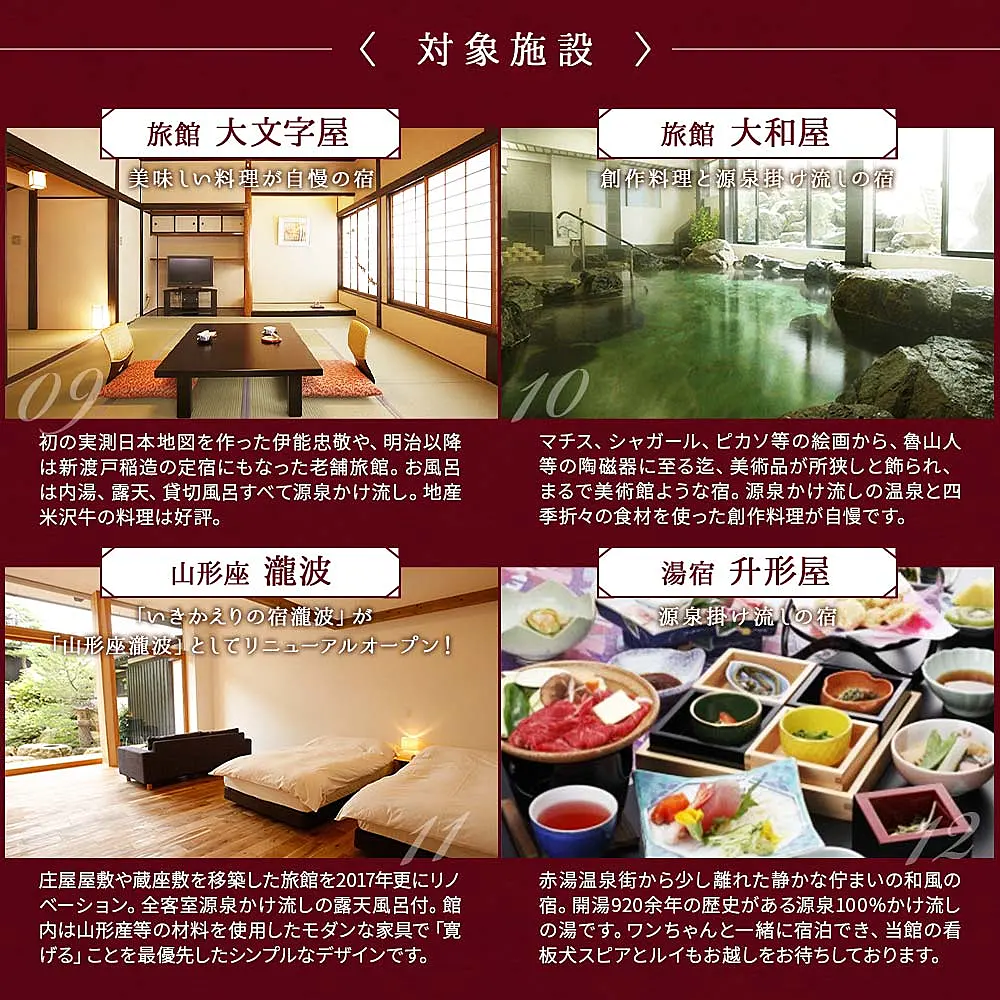 検索キーワード : 山形 南陽 赤湯 温泉 旅館 ホテル 宿泊 割引券 助成券 チケット クーポン 美肌 美人の湯 あったまり 個室 家族風呂 ペット 街歩き 御殿守 櫻湯 山茱萸 丹泉 丹波館 松島館 むつみ荘 森の湯 瀧波 升形屋 大文字屋 大和屋 OSTERIA SINCERITA オステリア・シンチェリータ