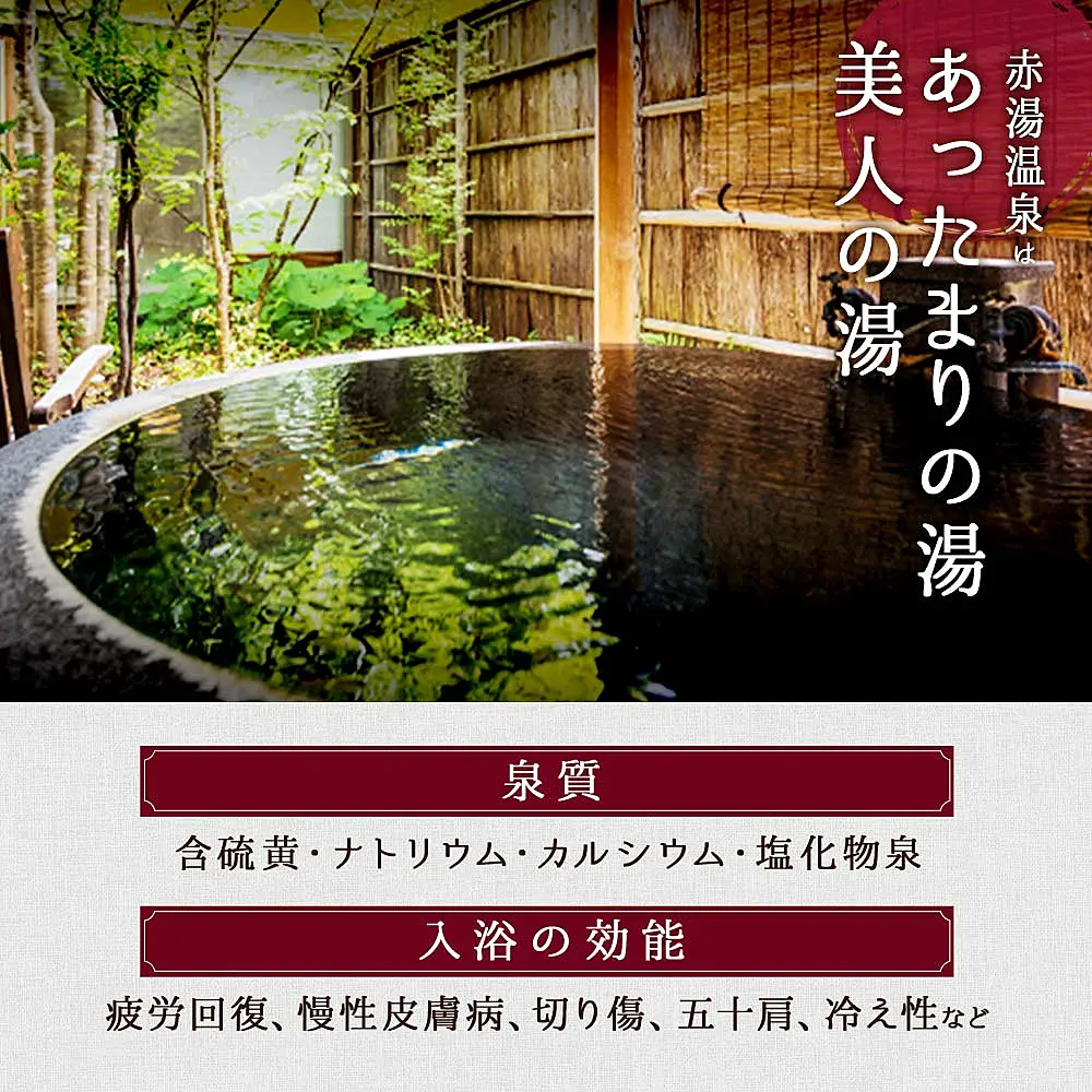 赤湯温泉の泉質は「含硫黄泉」。ナトリウム、カルシウム等が含まれ、古来から万病に効くと言われてきました。また、「メタケイ酸」の働きで“ツルツル肌”を実感しながら、体の芯までポカポカする「あったまりの湯・美人の湯」です。