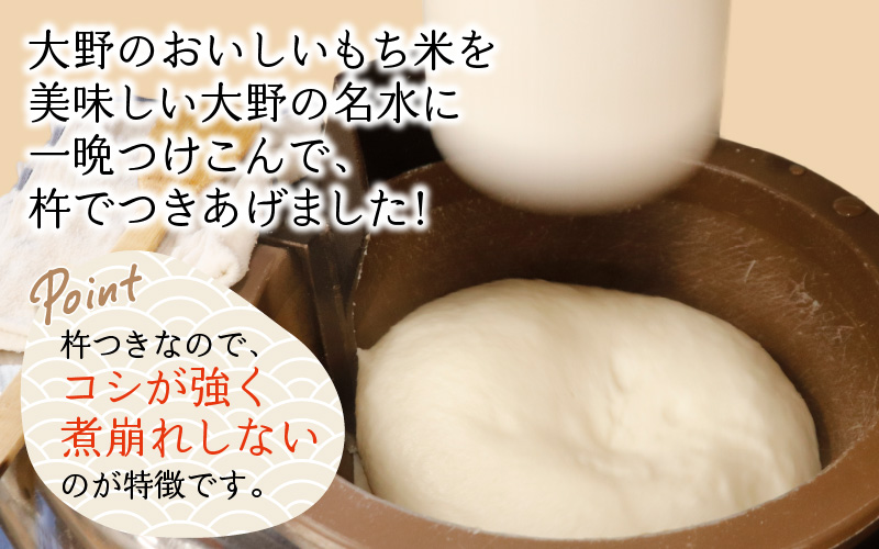 大野のおいしいもち米を美味しい大野の名水に一晩つけこんで、杵でつきあげた、お餅です。
