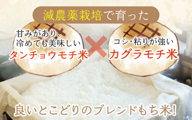 お餅の特徴としては、カグラモチの特徴であるコシ・粘りが強いところと、タンチョウモチの甘みと、冷めても美味しいという特徴を合わせもっており、更に杵つきなので、コシが強く煮崩れしにくいです。