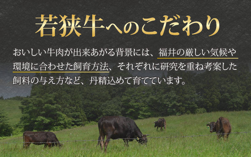 若狭牛の品質規格は、近県の銘柄牛と比較しても厳しく、5段階に別けられている肉質等級の3等級以上の高品質な牛肉のみが若狭牛として販売されています。脂肪交雑が密で色鮮やかな霜降り、きめ細かく柔らかい肉質が特徴で、ステーキ店、牛肉専門店などから、最高級の牛肉として、風味が良く、とろけるような舌ざわりと好評を得ています。