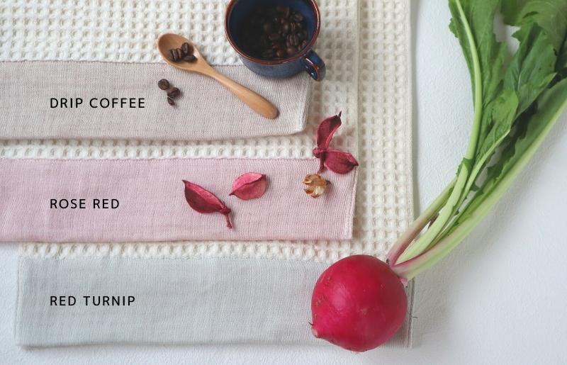 ダブルガーゼ部分の色糸には、廃棄予定の食材由来の染料で染めた「FOOD TEXTILE」の糸を使用し、優しい色合いのアクセントに。