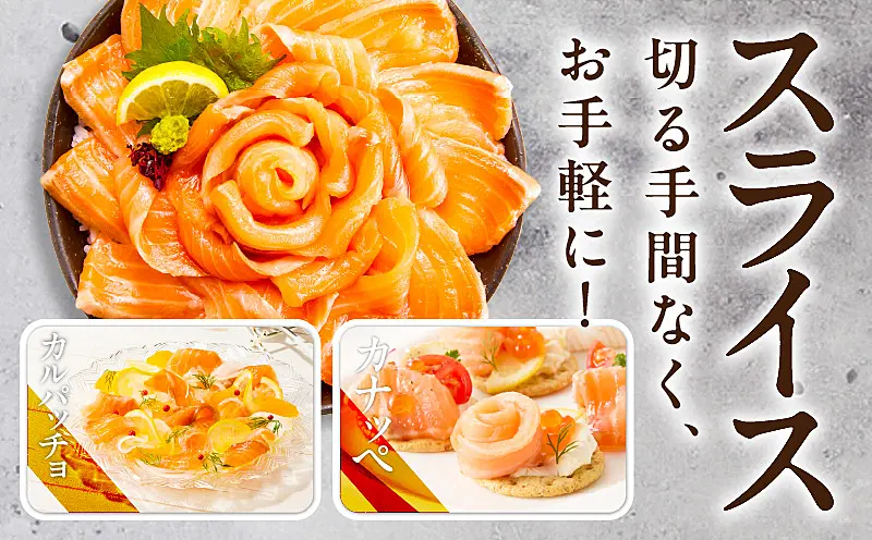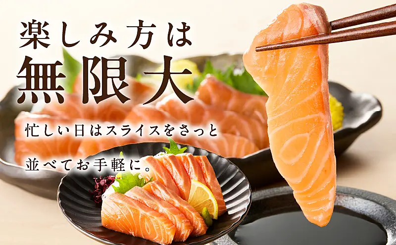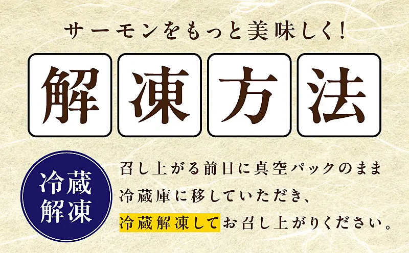 当該返礼品は、区域内の工場において、空輸されたサーモンの解体から骨の除去、切断、検品、包装、発送までの全ての工程を行っています。(告示第5条第3号に該当) - 内容量等