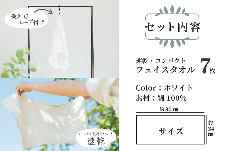 099H1554 速乾・コンパクト・肌に優しいガーゼ&パイルのループ付フェイスタオル7枚セット ホワイト