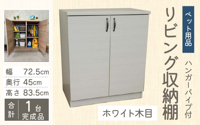 ハンガーパイプ付 リビング収納 ペット用品 子ども服 シンプル棚 幅72.5cm【ホワイト木目】