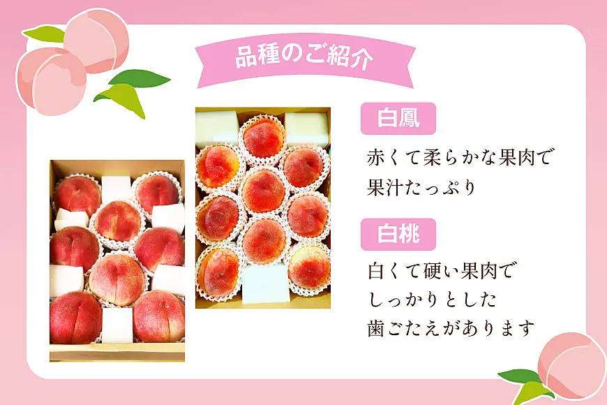 「白鳳」「白桃」は桃の中でも特に人気の品種で、その甘みと果汁の多さが特徴。