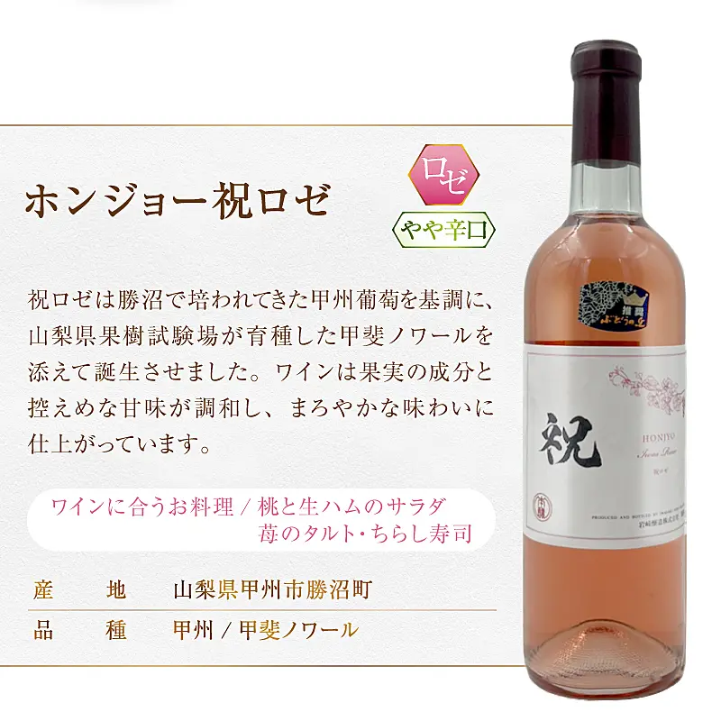 祝ロゼは勝沼で培われてきた甲州葡萄を基調に、山梨県果樹試験場が育種した甲斐ノワールを添えて誕生させました。ワインは果実の成分と控えめな甘味が調和し、まろやかな味わいに仕上がっています。