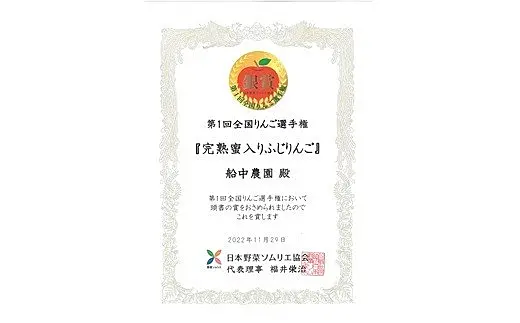 当園のりんごは、日本野菜ソムリエ協会による「第1回全国りんご選手権」において銀賞を受賞しました。