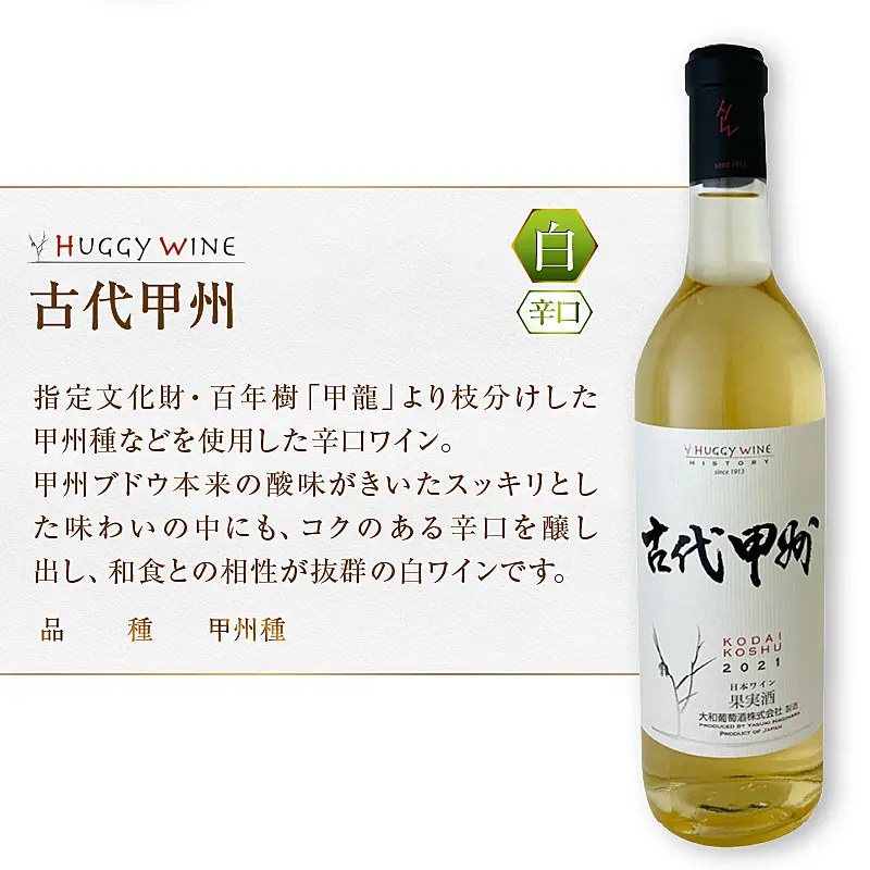 特徴:指定文化財・百年樹「甲龍」より枝分けした甲州種などを使用した辛口。甲州ブドウ本来の酸味がきいたスッキリとした味わいの中にも、コクのある辛口を醸し出し、和食との相性が抜群の白ワイン。
