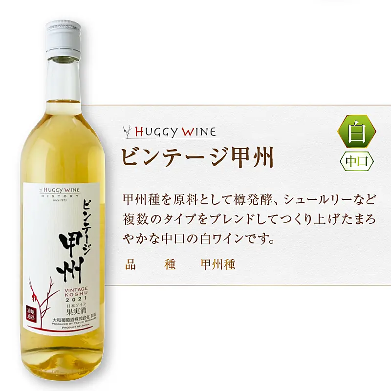 特徴:甲州種を原料として樽発酵、シュールリーなど複数のタイプをブレンドしてつくり上げたまろやかな中口の白ワイン。