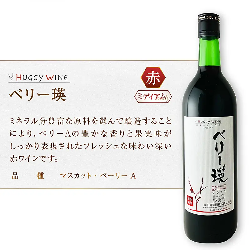 特徴:ミネラル分豊富な原料を選んで醸造することにより、ベーリーAの豊かな香りと果実味がしっかり表現されたフレッシュな味わい深い赤ワイン。