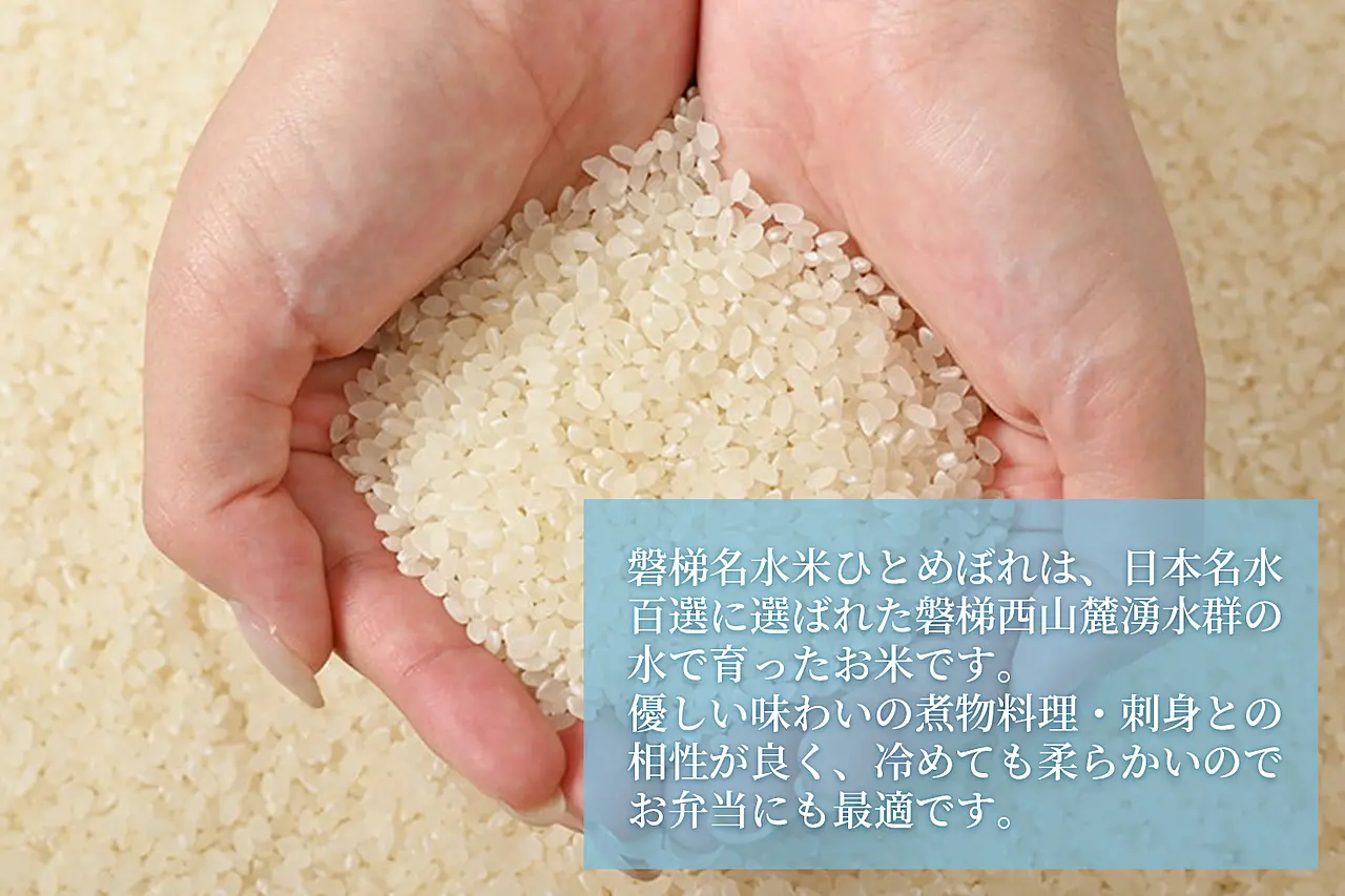 「磐梯山名水米ひとめぼれ」は、優しい味わいの煮物料理との相性が抜群で、刺身と相性もよく、冷めても柔らかいのでお弁当にも最適です。