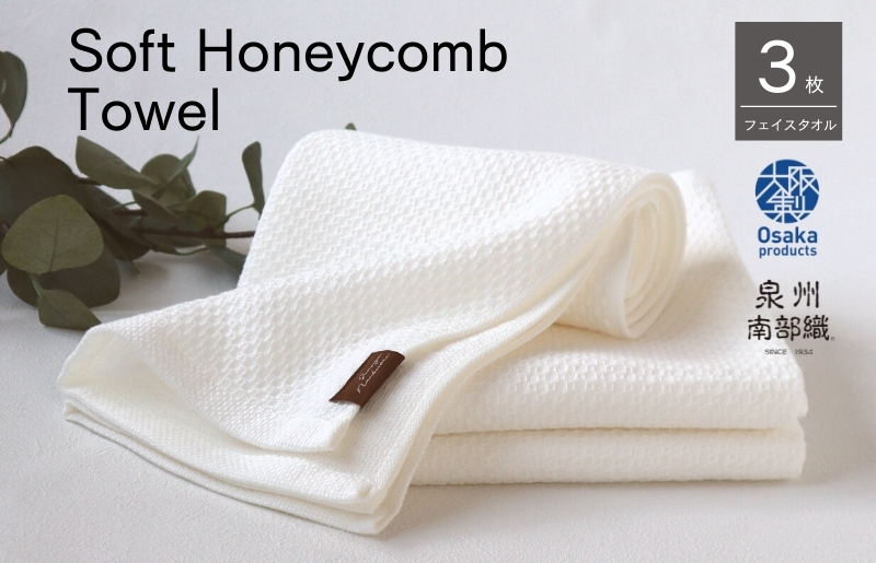 G1908 【ソフトハニカム】泉州南部織 フェイスタオル3枚セット(ホワイト)+ソフトハニカム織ハーフハンカチ1枚