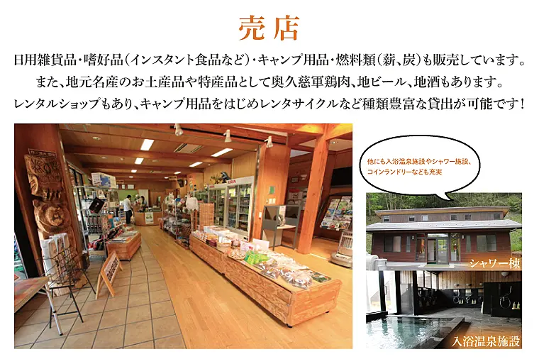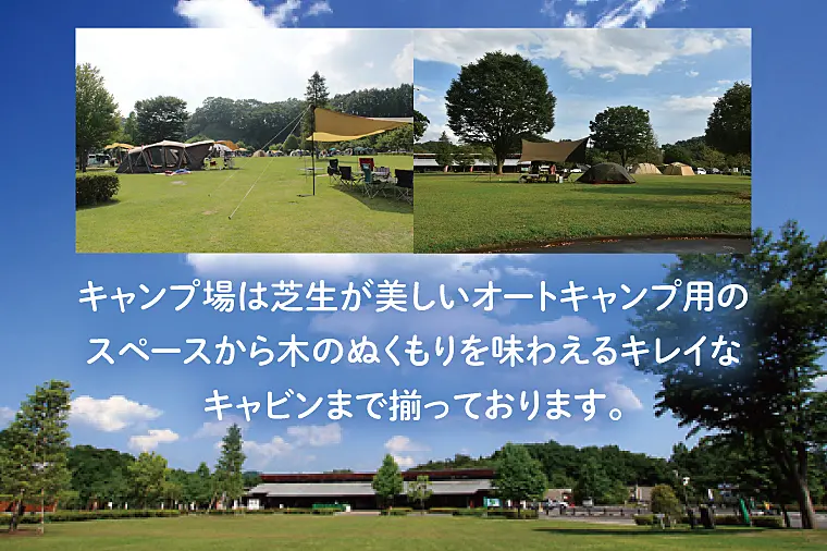 キャンプ場は芝生が美しいオートキャンプ用のスペースから木のぬくもりを味わえるキレイなキャビンまで揃っており、入浴温泉施設や売店、コインランドリーやシャワー施設などをはじめレンタルショップまで充実。