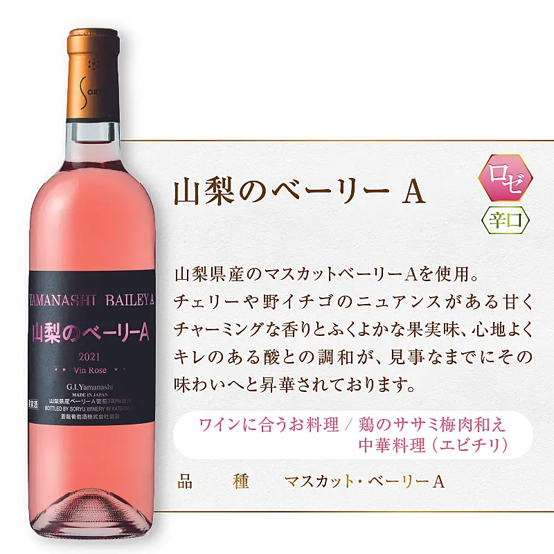 山梨県産のマスカットベーリーAを使用。チェリーや野イチゴのニュアンスがある甘い香り、ふくよかな果実味と、心地よい酸味が見事に調和した辛口タイプのロゼワイン。