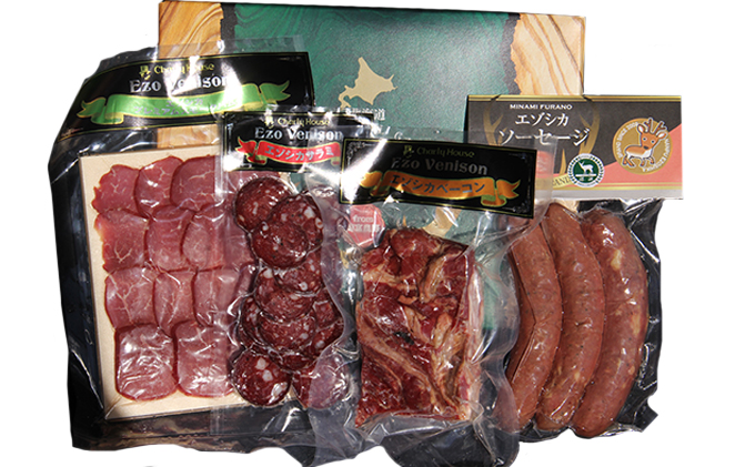【5回目】エゾシカソーセージ3本入(240g)、エゾシカサラミ(スライス)60g、エゾシカスモークハム60g、エゾシカバラベーコン200g 各1袋ずつ