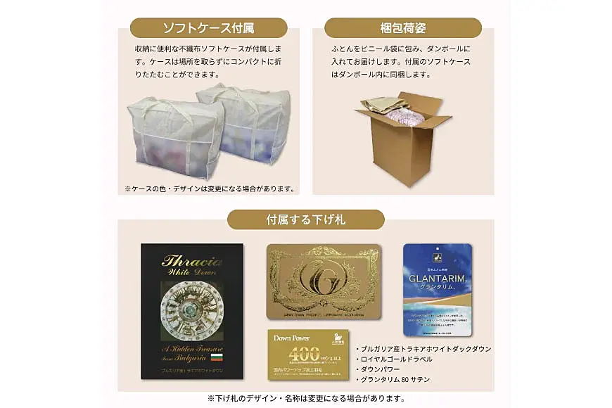 ※羽毛布団の特性上、縫い目や側生地からごく微量の羽毛が出てくることがありますが使用上問題はありません。