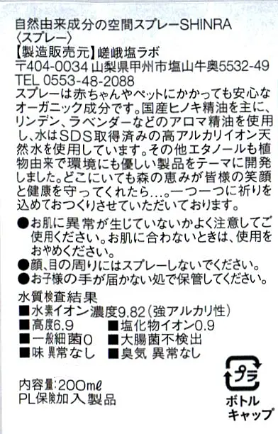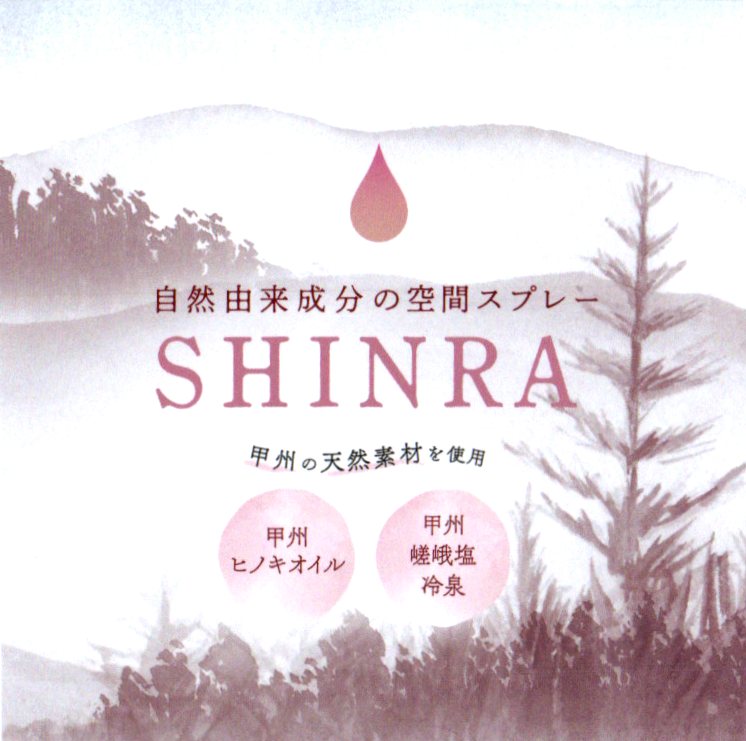 甲州嵯峨塩冷泉は、山梨県森林100選にも選ばれた広葉樹林の深い森が、長い年月をかけて育んだ水素イオン濃度9.82の命に満ちた素晴らしい冷泉です。この一帯の地層は、厚い花崗岩の岩盤層が地中深く連なっており、掘削には10か月を要し、汲みだしています。近隣に居住者が長い事おらず、知名度こそ無いものの、水質検査に出した折は、調査をしていただいた先生が「こんな水まだあったんだな!」とお声掛けいただき、本当に嬉しかったものです。この冷泉と深い森の息吹を街に住む皆様にも届けたい!そうしてSHINRAは生まれました。SHINRAは森羅万象の森羅から名前を付けました。森羅の意味は、無数に並び連なること、天地の間に存在するもろもろのもの、という意味だそうです。日常の様々なストレスを感じてしまう時、このスプレーを使っていただいて、皆様に森羅のように心が広がっていって欲しい、そんな願いをこめてお仕度させていただいております。また、森の命を感じて欲しいとの思いから、スプレーはご注文いただいてから1つ1つお仕度させていただきます。完成の証として商品発送時、生葉の桧のブーケをお付けいたします。ご自宅やオフィスのデスクに飾っていただけたら幸いです。アロマは主成分は山梨県の桧オイルを惜しみなく使用しております。他リラックス効果の高い希少なアロマオイルを数種類使用しております。