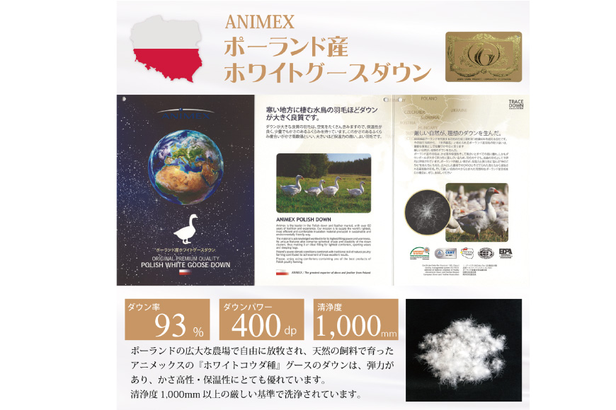 ポーランド羽毛を代表するアニメックス社のポーランド産ホワイトグースダウンをたっぷりと1.3kg使用。