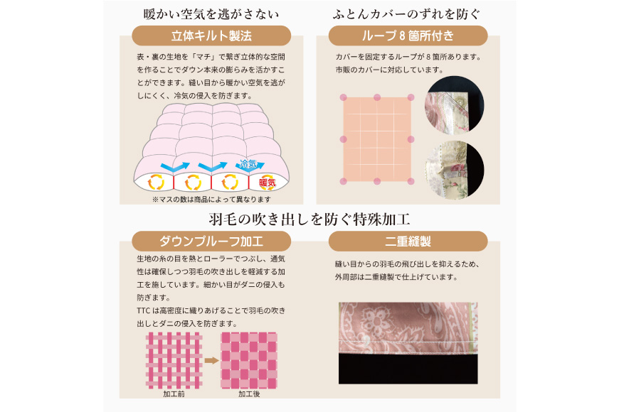 ※羽毛布団の特性上、縫い目や側生地からごく微量の羽毛が出てくることがありますが、使用上問題はありません。