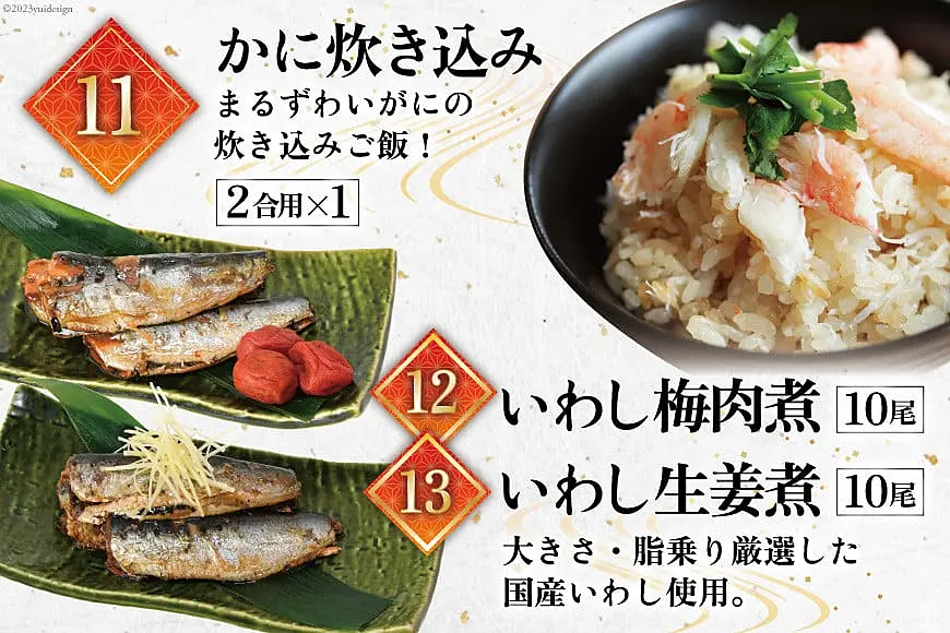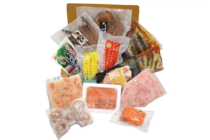 - 製造より365日:鱒いくら、ずわいがにほぐし身、トラウトサーモンスライス、宮城銀鮭の西京漬け、ミニフカヒレ姿煮、牡蠣の炊き込みご飯の素、かにの炊き込みご飯の素、いわし梅肉煮、いわし生姜煮