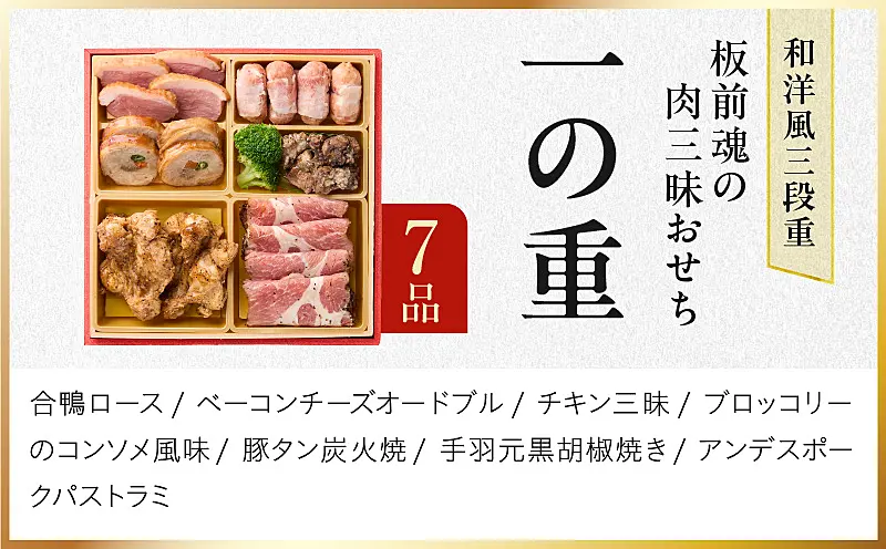Y106 おせち「板前魂の肉三昧おせち」和洋風 三段重 30品 3人前 ステーキ&豚角煮&ユッケ風ローストビーフ&生ハム 付き