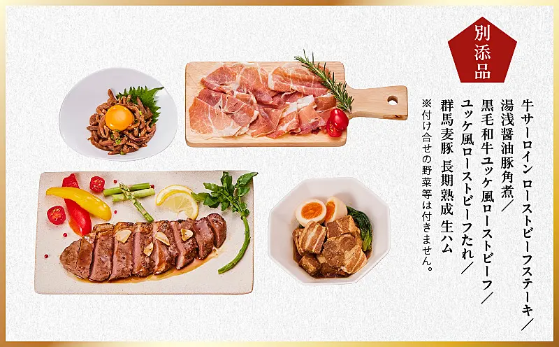 牛サーロイン ローストビーフステーキ 1枚、湯浅醤油豚角煮 200g、黒毛和牛ユッケ風ローストビーフ 55g、ユッケ風ローストビーフたれ 1個、群馬麦豚 長期熟成 生ハム 50g