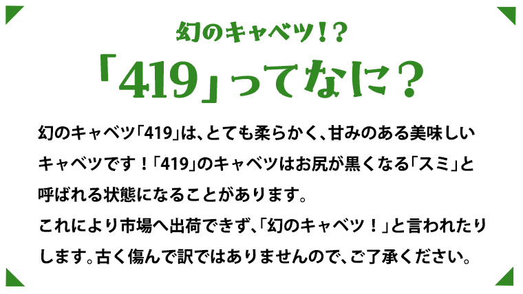 ・嬬恋キャベツ419は暑さに弱く、溶けることがあります。冷蔵庫へ保管し、お早めにお召し上がりいただきますようお願いします。