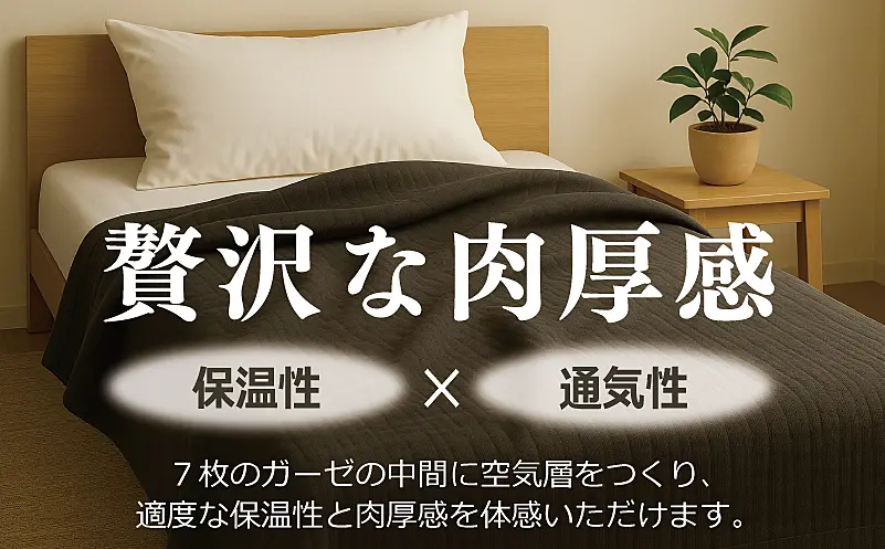 単色後染めならではの味わい深い色彩で、7枚のガーゼの中間に空気層をつくり適度な保温性と肉厚感を体感いただけます。暑い日も適度な通気性で、熱がこもらず爽快です。