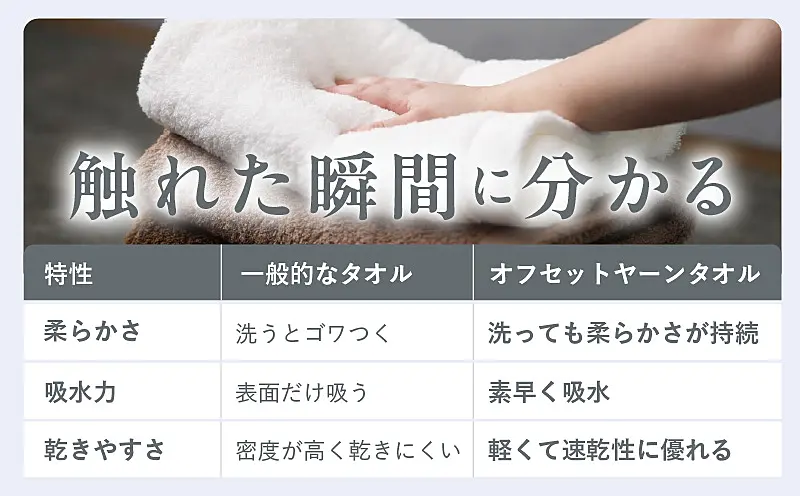 ■オフセットヤーンは実用新案第315942号を取得。タオル製品において独占契約をしていますので、当社でしか味わえない使い心地です。