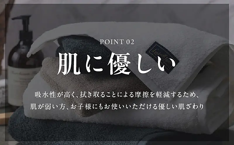 ふかふかの肌触りを重視するためにパイルを長くし、肌に触れるだけで吸水するようにしました。柔軟剤を使わなくても柔らかく、吸水性に優れた使い心地はまるで吸いつくような新しい感覚のタオルに仕上がっています。甘織りの製品で洗濯後の乾きも早いのが特長です。