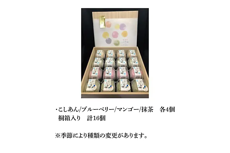 - こしあん・ブルーベリー・マンゴー・抹茶各4個