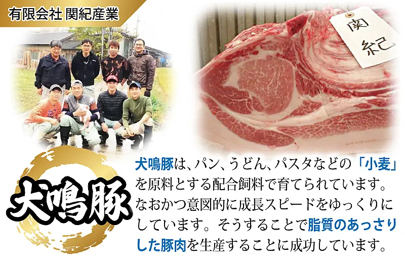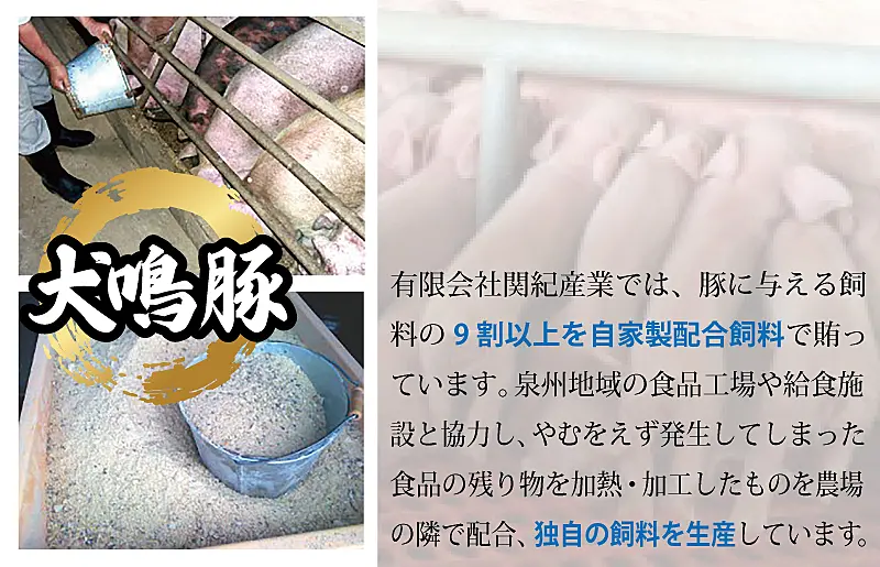 「犬鳴豚本店」(関紀産業直営精肉販売店舗)にて豚肉の小売り販売まで手掛けており、養豚から販売まで一貫経営をしております。