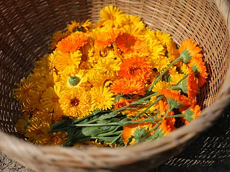 ポットの中でひらひら舞うカレンデュラのオレンジがアクセント。