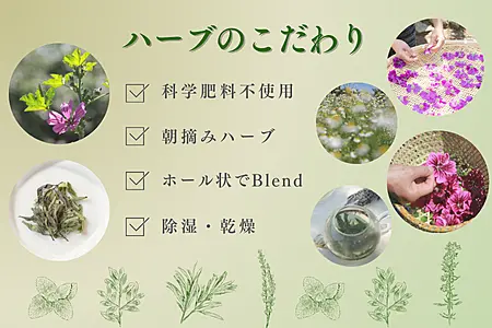 化学肥料不使用、農薬不使用(栽培期間中)で育てたハーブを毎朝手作業で摘み、除湿・乾燥してティーバッグにしています。