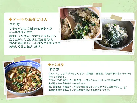 <旨み>の強い野菜は、料理が得意でなくても塩だけで美味しいのですが、農場おすすめのぷらすレシピ・まかないレシピも付いています。