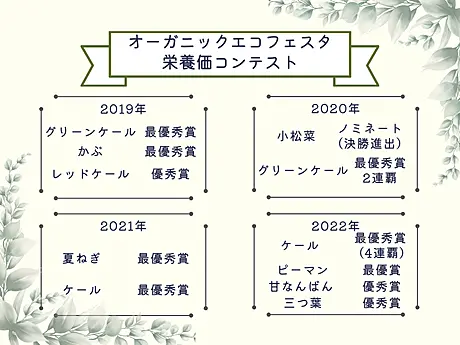 栽培期間中、化学合成された農薬、化学合成された肥料を使用せず土壌分析に基づいて、年間約60品目を栽培しています。