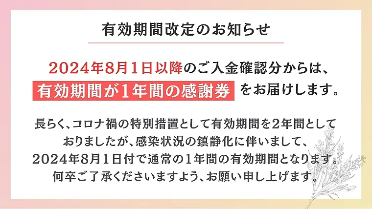 (2024年8月1日以降のご入金確認分からは、有効期間が1年間の感謝券をお届けします。)