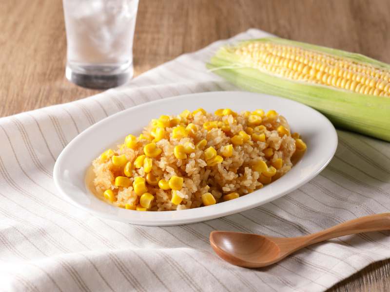 芽室町はスイートコーン生産量日本有数を誇っています。炒飯の上には、その自慢のとうもろこしがたっぷりのっています!