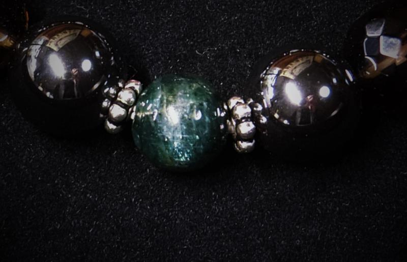 ムーンストーン、グリーンアパタイト、天然石の間の飾りは銀製(純度92.5%)です。オペロンゴムを使用して製作しております。