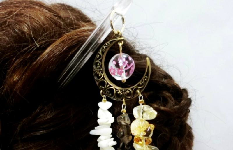 - 〈使用している石、部材〉水晶(花の彫刻入り)、インカローズ、スモーキークォーツ、マザーオブパール、シトリン、レッドコーラル、透かし月型はメタルチャーム、棒の部分はアクリル製