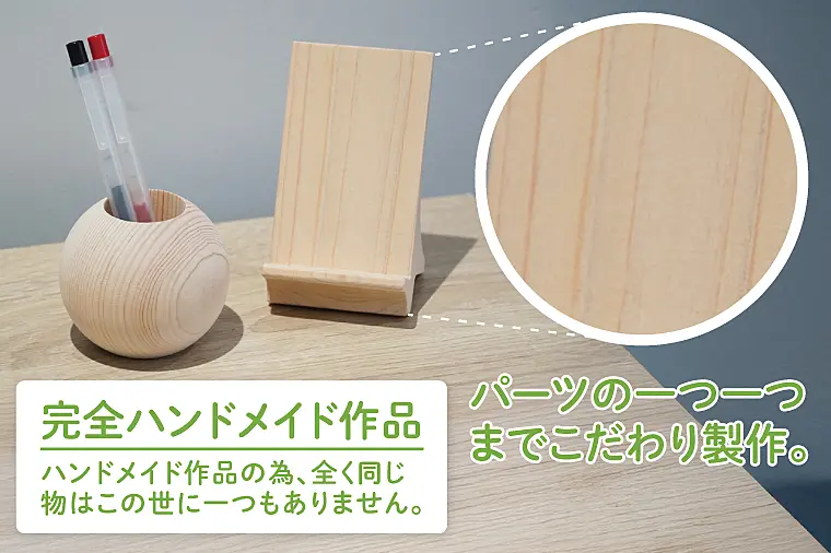 陽の光をたくさん浴びて育った茨城県産ヒノキで作ったスマホスタンドとペン立てのセットです。