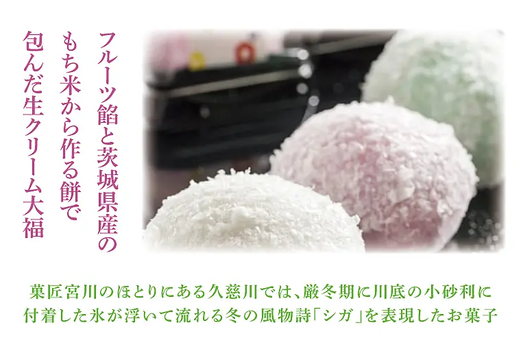 コクがありながらさっぱりと食べられる生クリーム、素材を活かした風味豊かなフルーツ餡と茨城県産のもち米から作る餅で包んだ生クリーム大福です。