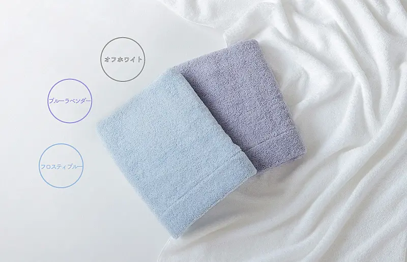 - バスタオル3枚(フロスティブルー、ブルーラベンダー、オフホワイト 各1枚)/バスタオルサイズ 約60×120cm /バスタオル1枚あたり約345g